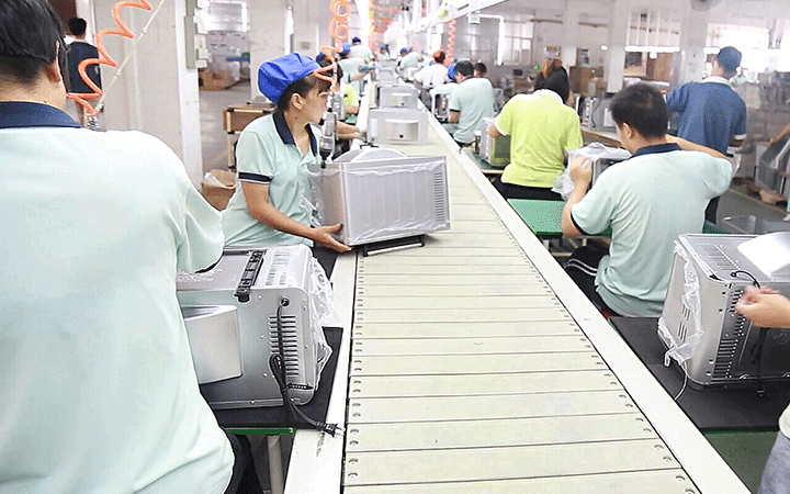 主要由鏈板輸送線組成,鏈板輸送機的輸送面平坦光滑,摩擦力小,可以游刃有余地輸送烤箱配件并進行組裝。
