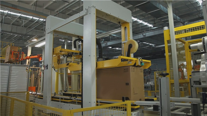 自動包裝系統由自動繞膜機、自動開箱、套箱、自動打釘、打包機、自動化下線機等組成: