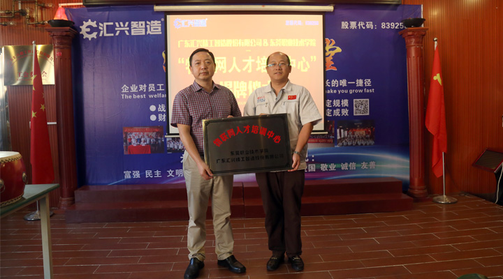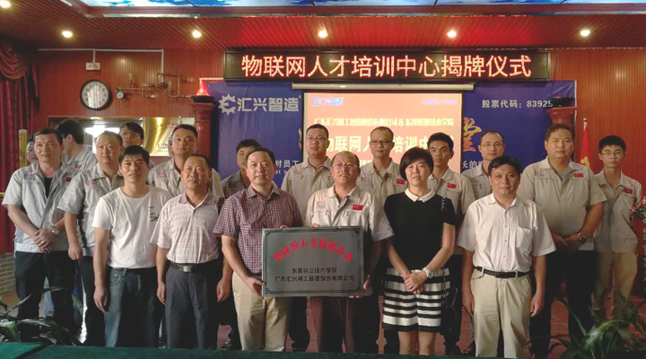 2017年9月27日下午, 東莞職業技術學院副院長楊云奇,計算機工程系主任胡選子博士,藝術設計系主任何鳳梅博士,計算機系曹文梁教授等專家人員一行蒞臨廣東匯興精工智造股份有限公司(股票代碼:839258)考察調研并舉行“物聯網人才培訓中心“基地揭牌儀式。匯興智造董事長鐘輝,匯興中德智能制造研究院院長李康順教授熱情接待了調研組一行。