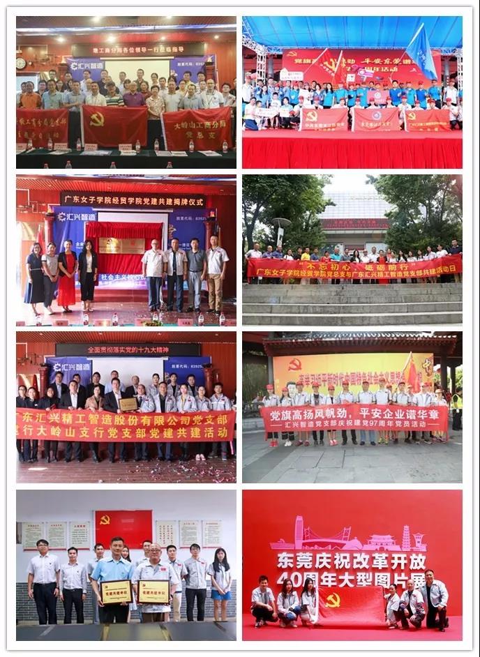 【附簡介】中國共產黨廣東匯興精工智造股份有限公司支部委員會(簡稱:匯興智造黨支部)成立于2017年5月匯興智造黨支部,現有正式黨員9人,入黨積極分子2人。教授級高工,匯興智造技術總工程師許光輝任黨支部書記,匯興智造黨支部圍繞“社會主義核心價值觀”為核心,高舉“黨旗映車間,助企創輝煌“ 旗幟,激勵全體黨員積極進取處處帶頭,增強黨員使命感和責任感,帶領全體員工,完成企業使命,承擔社會責任,回報社會、感恩社會,使企業具有強大的凝聚力和生命力,實現社會與企業的和諧發展。2018年,以黨建帶團建,匯興團支部榮獲“大嶺山五星團總支”,董事長鐘輝榮獲“南城街道 2018 年度‘兩新’黨組織優秀共產黨員”,匯興智造獲評東莞首批十家友善企業。