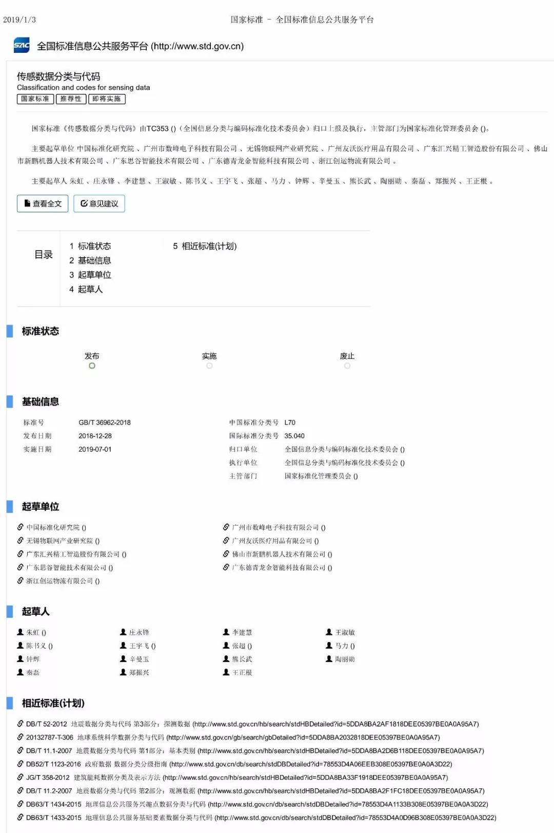 1月10日,國家市場監(jiān)督管理總局、國家標(biāo)準(zhǔn)化管理委員會(huì)發(fā)布了《中華人民共和國國家標(biāo)準(zhǔn)公告》2018年第17號(hào)。由匯興智造參與起草的國家標(biāo)準(zhǔn)《傳感數(shù)據(jù)分類與代碼》獲準(zhǔn)公布,并將于2019年7月1日開始實(shí)施。