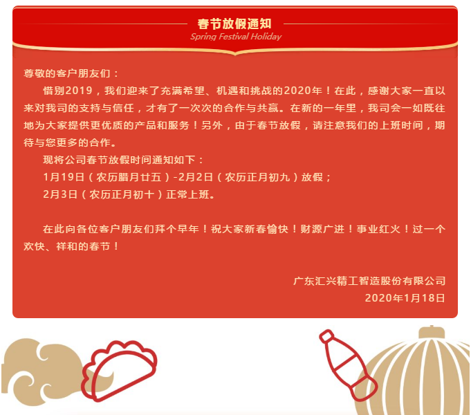 各位親愛的同事、尊敬的客戶: 2020新年伊始,匯興智造在此向大家致以新春的問候和開工復產的美好祝愿!感謝大......